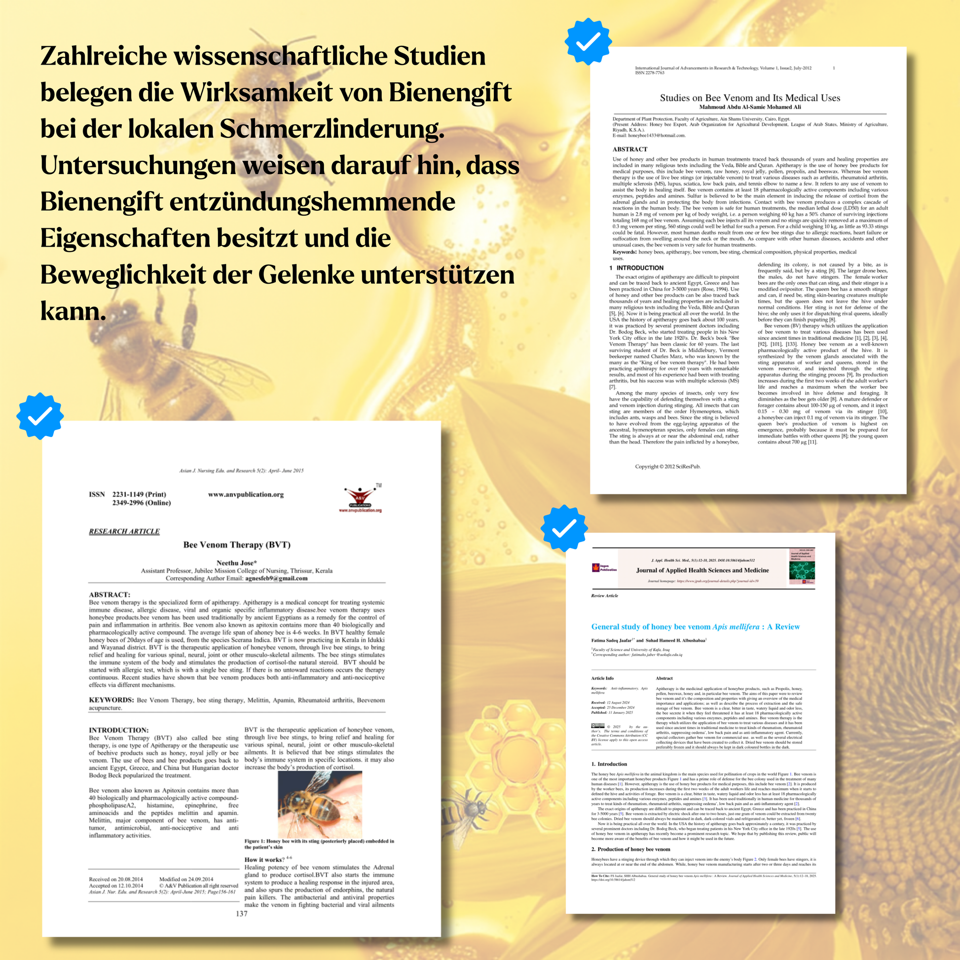 De werking van bijengif (Apitoxin) is onderbouwd door talrijke wetenschappelijke onderzoeken. Veel gebruikers ervaren blijvende verbetering van hun mobiliteit en comfort.